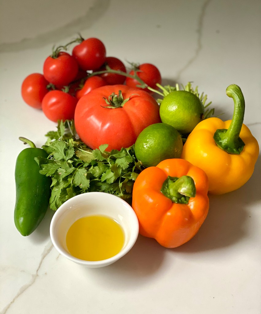 2. Finely dice the bell peppers, tomatoes, and jalapeño. Remove the bitter white parts of the peppers, and toss out the liquid seed portion of the tomatoes. Combine in a large bowl or dish.