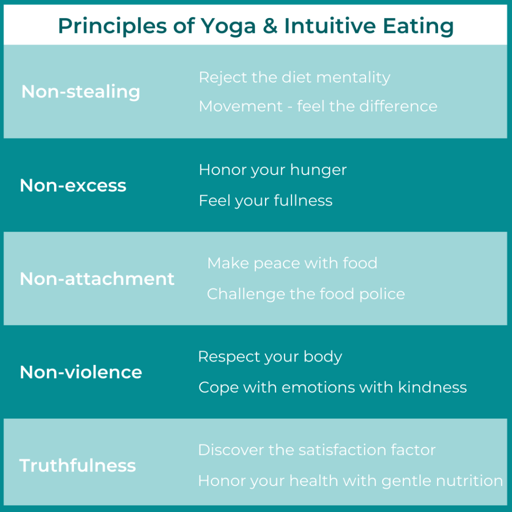 There are many overlapping principles between the yamas and intuitive eating. Just as intuitive eating addresses both physical and mental health, the yamas (or ethical principles) also address the mind and spirit because these have a significant impact on the physical body.