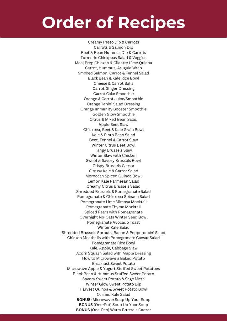 The recipes feature seasonal foods of citrus fruits (oranges, lemons, limes), pomegranate seeds, brussels sprouts, kale, beets, carrots, sweet potatoes, and acorn squash.