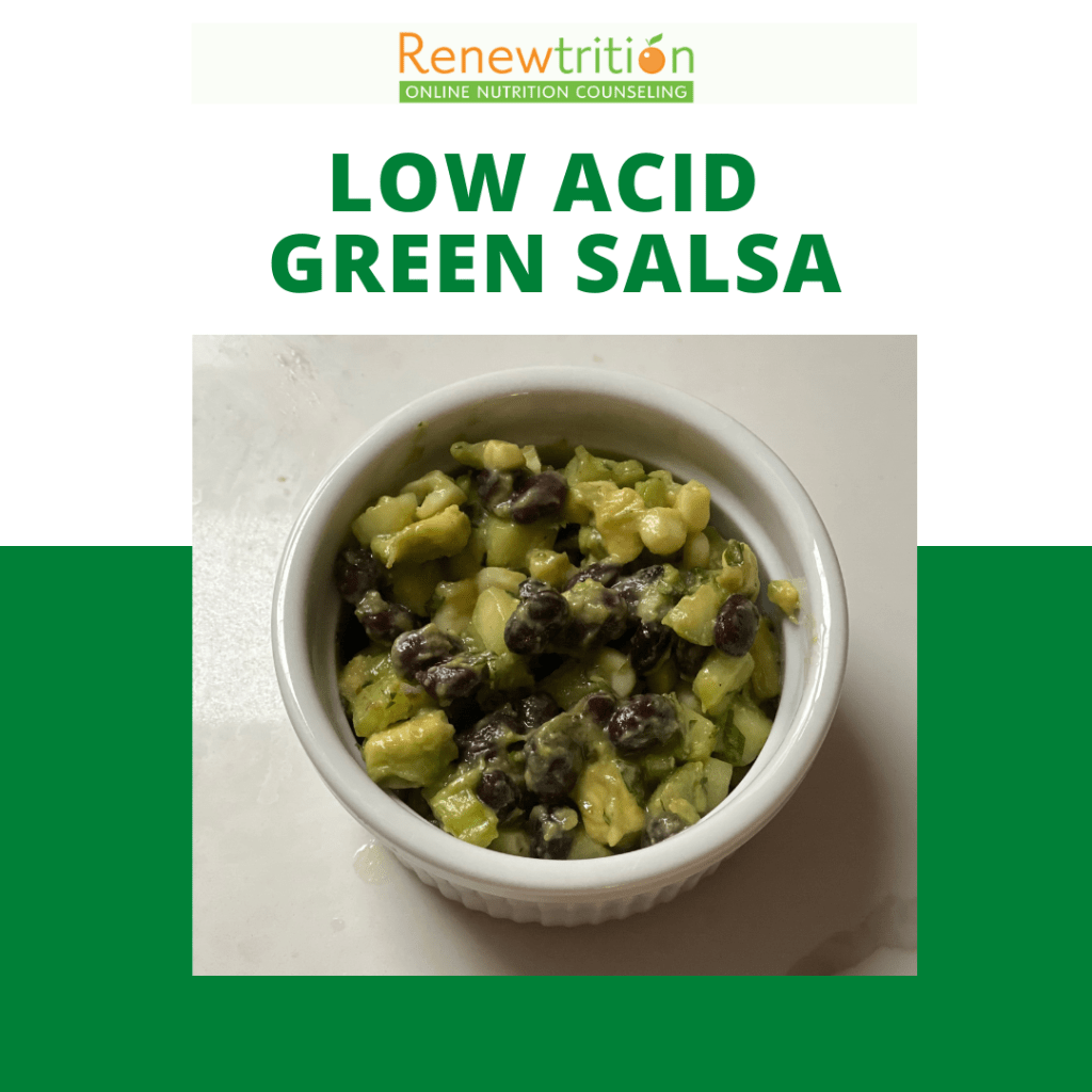 This quick & easy green salsa recipe using less acidic ingredients than traditional salsa.